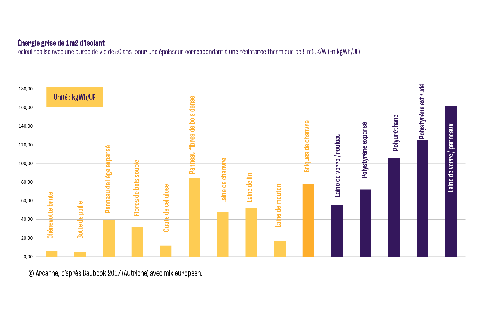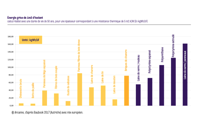 D’une part, ils consomment en règle générale moins d’énergie grise (Figure ci-dessous). En d’autres termes, l’énergie nécessaire à leur production est plus faible que pour les autres types d’isolants, de même que les gaz à effet de serre émis lors de leur fabrication. Certains produits comme la ouate de cellulose, le chanvre ou la paille sont en outre disponibles de manière locale et nécessitent ainsi peu de transport.