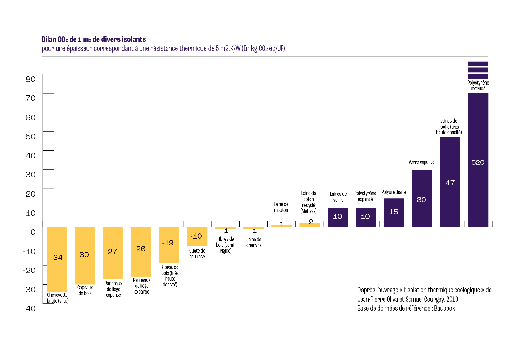 Mais le bilan est encore meilleur si l’on prend en compte la séquestration carbone. Au cours de leur croissance, les fibres végétales (chanvre, bois, paille, coton, etc.) séquestrent du carbone, ce qui aboutit potentiellement à des émissions nettes de carbone négatives lors de leur utilisation en isolants (figure ci-dessous).